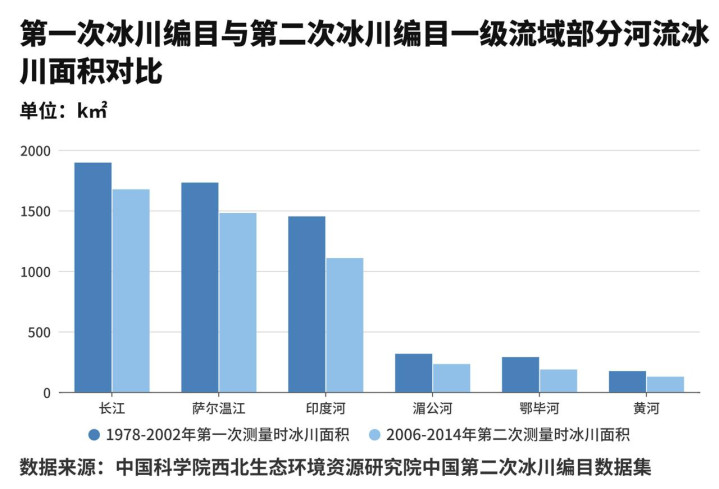 在中国第一次冰川编目完成到中国第二次冰川编目完成的12年间,长江流域的冰川面积从1895km2减少到了1674.69km2,其它流域的冰川面积也有不同程度的减小。