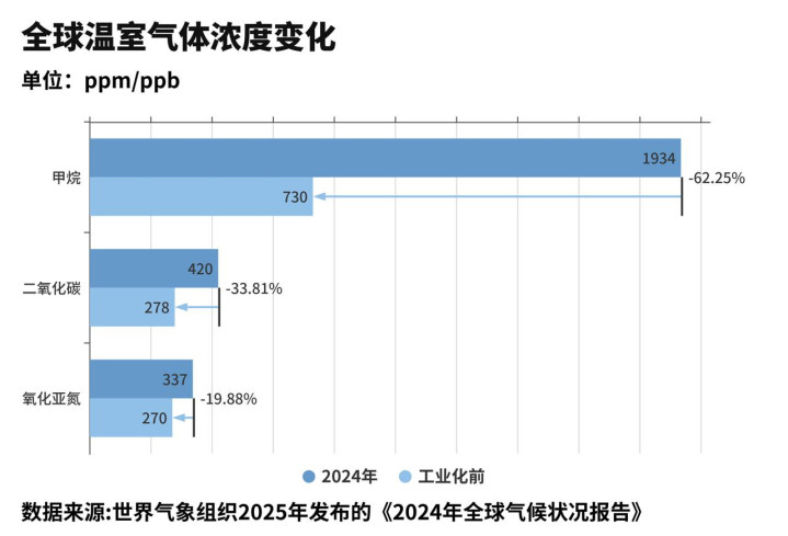 自工业革命以来,温室气体浓度持续上升,导致全球平均气温显著升高。温室气体浓度加速累积,导致全球气温突破临界阈值。《2024年全球气候状况报告》数据显示:2024年成为有记录以来最热的一年。
