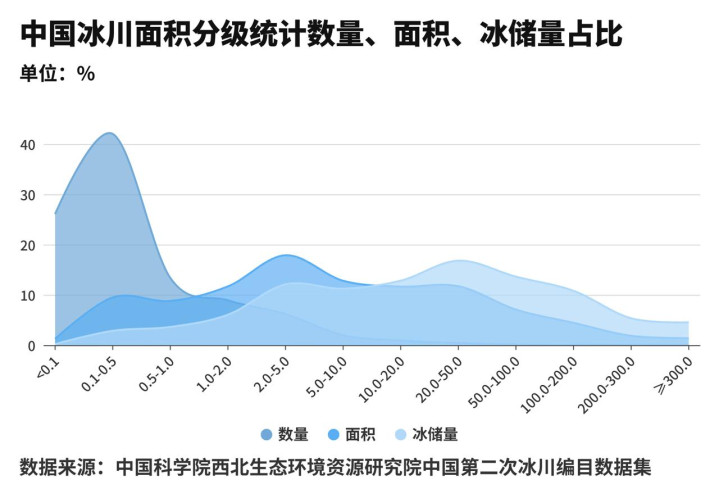 我国的冰川数量以小面积冰川为主,其中面积小于0.5km2的冰川约占全国冰川总数量的7/10;面积则以介于1.0~50.0km2的冰川为主,占全国冰川面积的3/5以上。