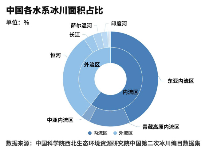 在各水系中,中国内流区的冰川数量和面积均多于外流区,其中内流区冰川占总面积的3/5,外流区约占总面积的2/5。