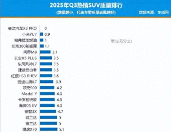 在SUV市场的激烈竞争中,睿蓝汽车X3 PRO 凭借“零投诉”的表现成功登顶,这一成绩不仅使其稳坐榜首,也从侧面印证了其在品控体系上的严格标准,不过这可能也与其并不算亮眼的销量有关,较小的基数让其投诉量也相对较少。紧随其后的是市场关注度较高的 小米YU7,它以万分之0.9的投诉比拿下亚军。作为一款6月底才上市的新车,小米YU7在迅速实现月销过万辆的同时,能保持如此低的质量投诉,为其市场口碑提供了强有力的支撑。