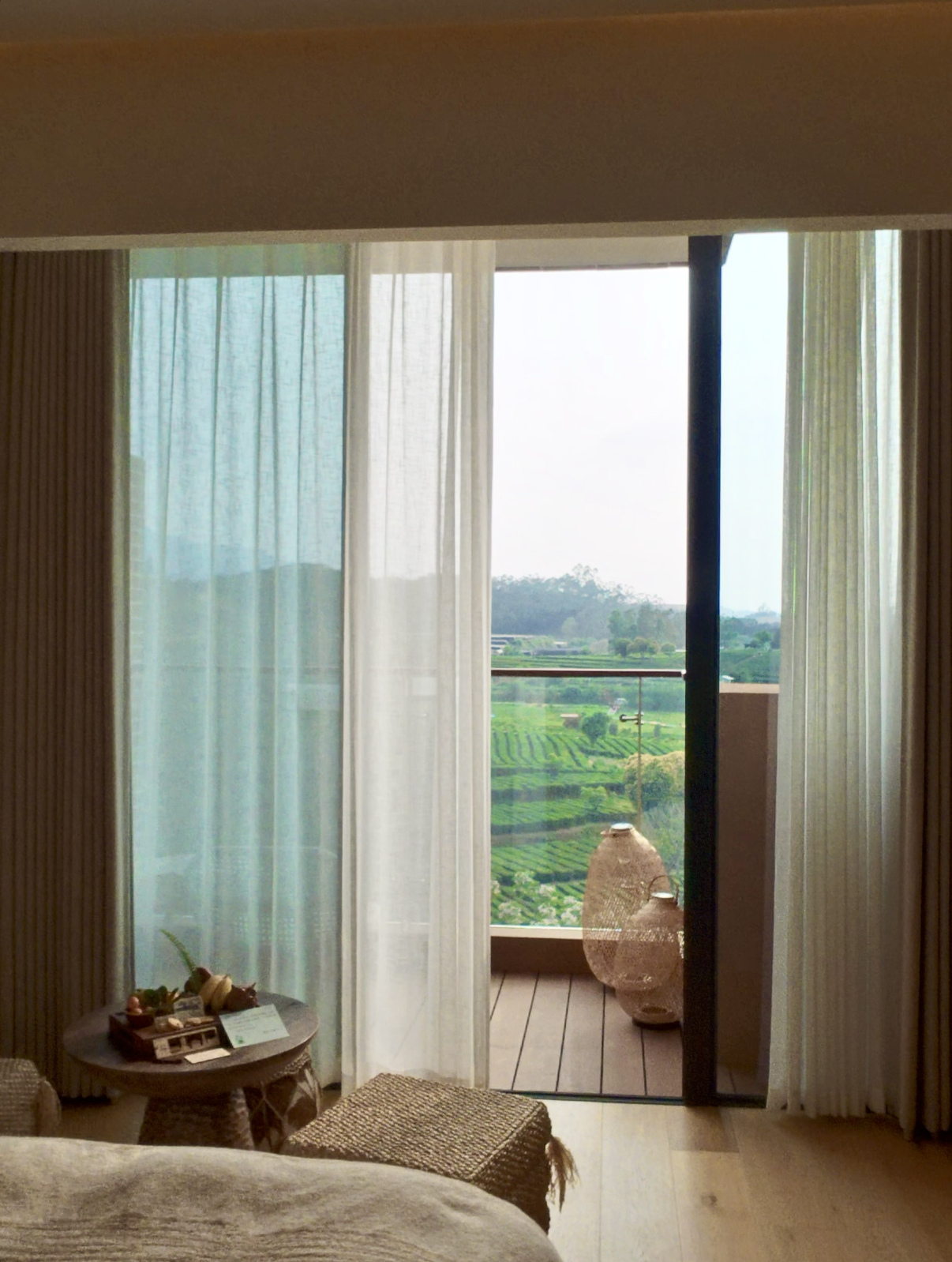 阳台推门而出就看见连绵的茶山,几乎没有遮挡。清晨时,山间微凉的雾气湿润而静谧;日出后光线变得明亮,茶田的层次逐渐显现出来。在这样的空间里,停留的时间也更容易被拉长——哪怕只是坐着发呆。房间不再只是休息的功能空间,而成为度假体验的一部分。这种对“停留”的鼓励,也与bynaked整体的度假逻辑一致。