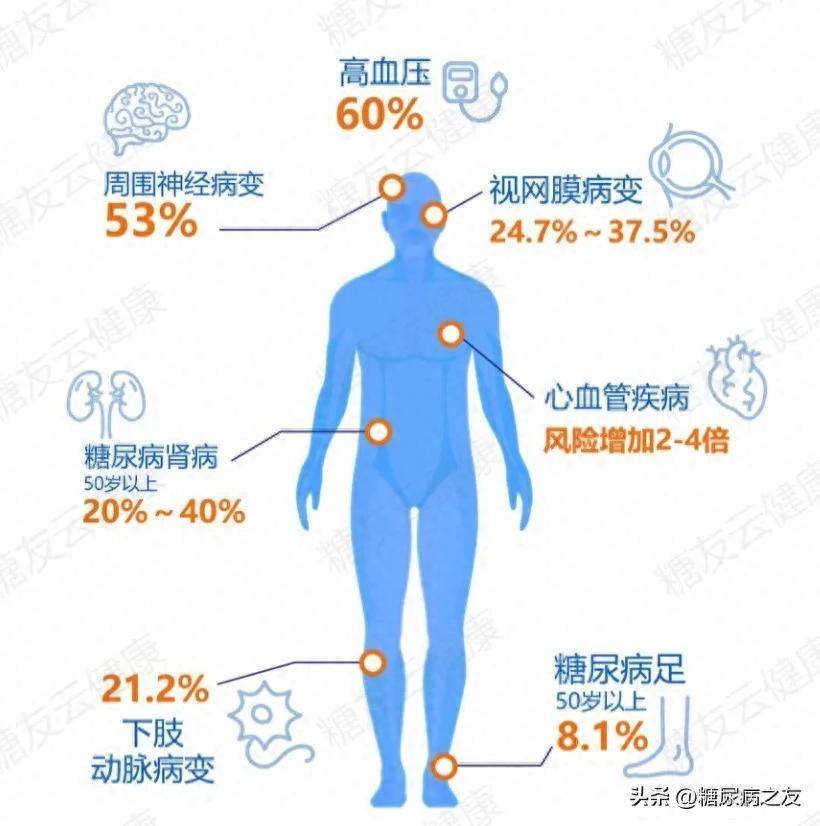 血糖长期偏高,就像把全身的血管泡在糖水里——最先受伤的是最细最脆的小血管,眼底、肾脏首当其冲;时间一长,大血管也跑不掉,心脑血管风险随之上升。